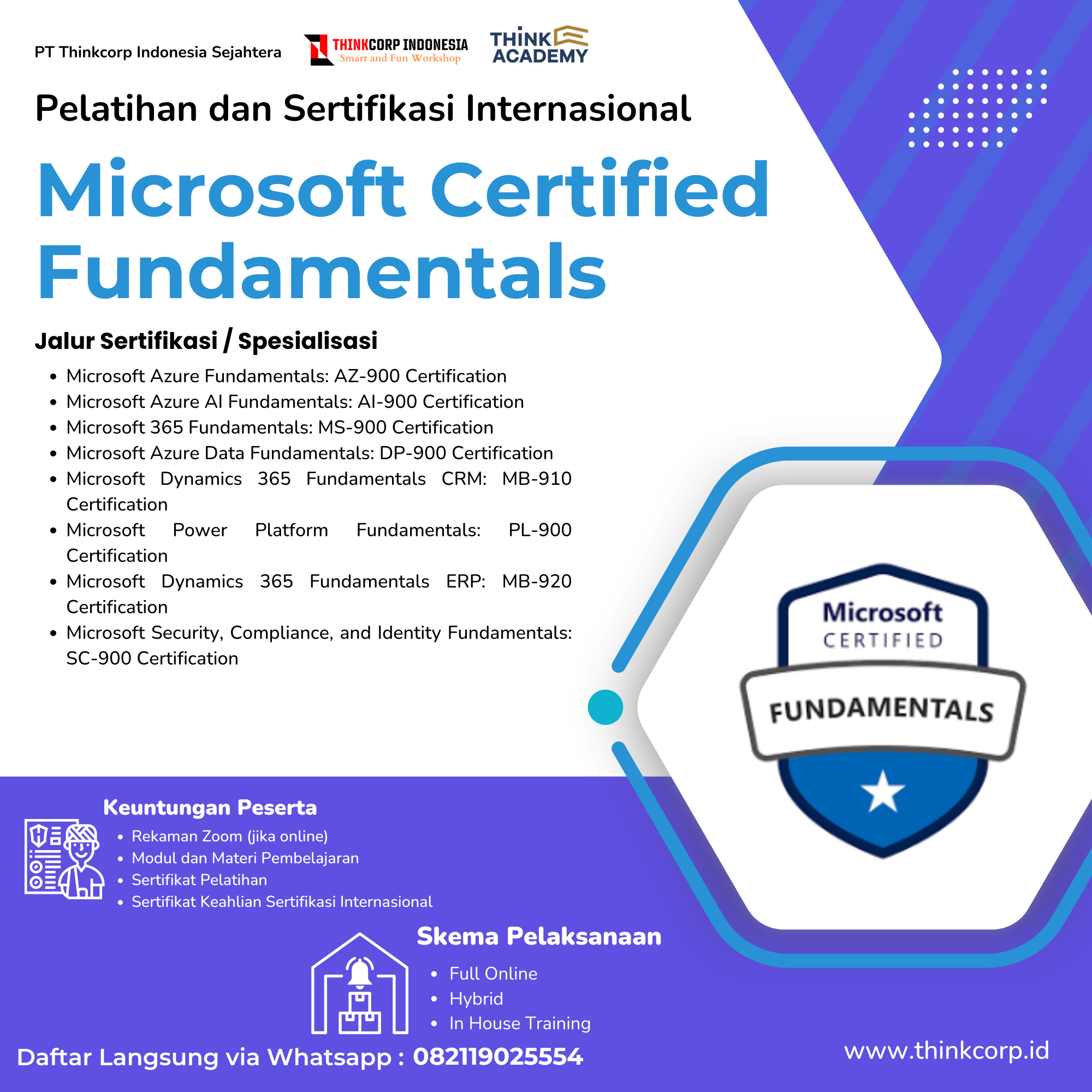 Setiap sertifikat memiliki Unique Nomor ID yang dapat digunakan untuk verifikasi keaslian sertifikat melalui website Thinkcorp.id. Sehingga peserta tidak perlu khawatir akan keaslian sertifikat dan setiap sertifikat tidak dapat di copy dengan oleh pihak yang tidak bertanggung jawab.
